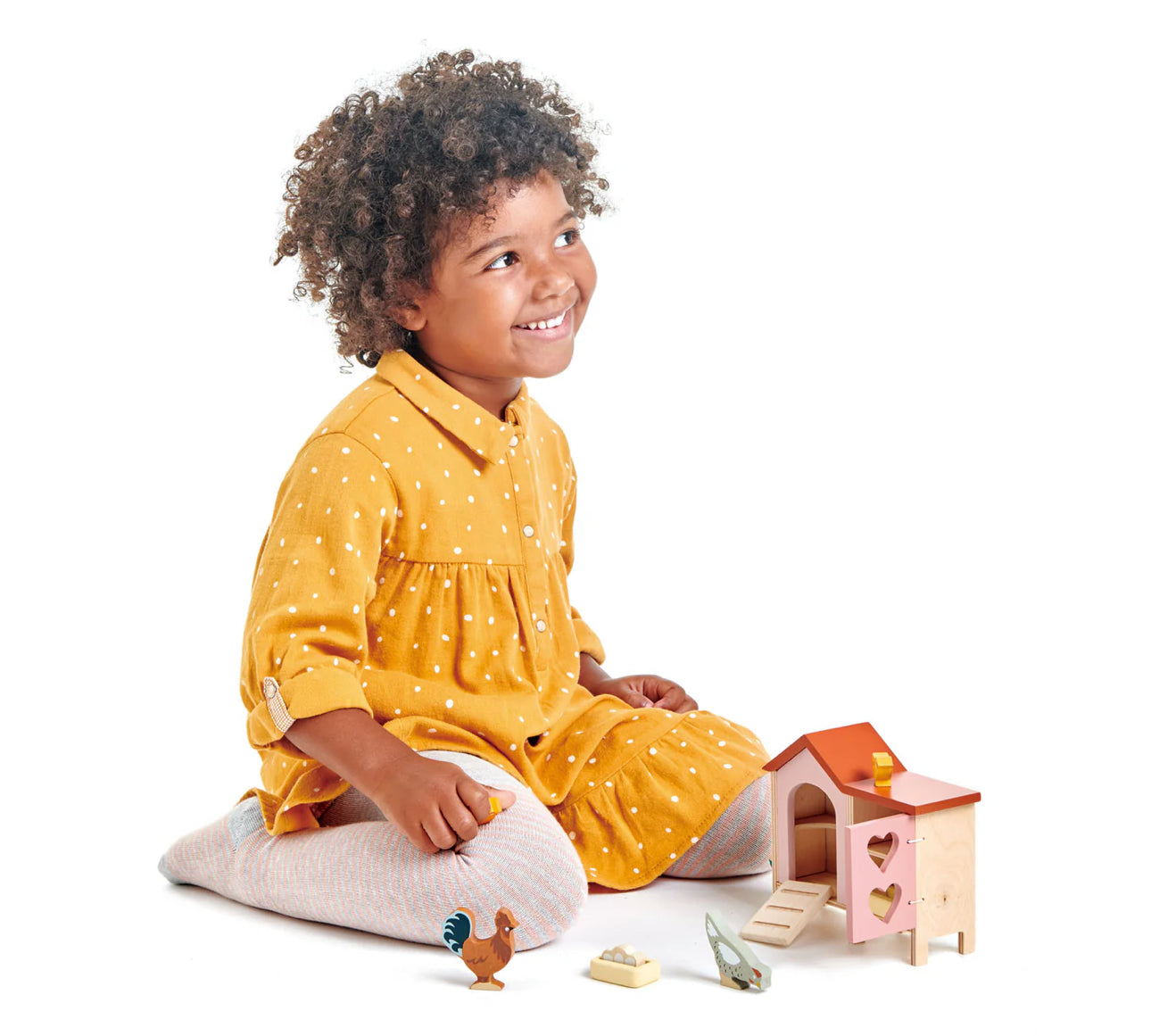 A sweet wooden chicken coop and family; a rooster, 2 hens, a little chick, freshly laid eggs, 2 nests, and a feeding trough.