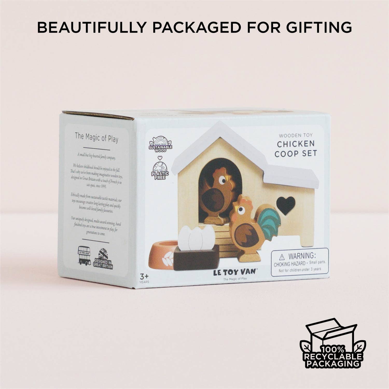 Introduce children to farmyard life with this beautifully crafted six-piece Wooden Chicken Coop Playset, designed for engaging and imaginative play. Made from FSC®-certified wood, it features a charming hen and baby chick, along with a chicken coop that has a functional lift-up roof, allowing children to collect eggs with ease. A sturdy ramp provides access to the coop, and a feeding bowl encourages realistic role-play, enhancing the farmyard fun.