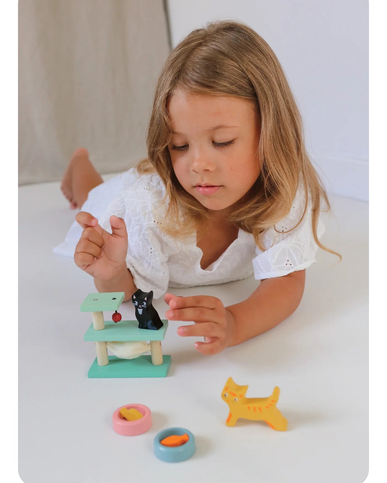 2 little cats, black and ginger with a play table and ball to amuse themselves. 2 differently colored bowls each with a fish for dinner! Suitable for all the wooden dolls houses, as scaled to 1:12.